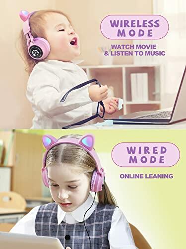 Kids Wireless Bluetooth Headphones with Microphone, Colorful LED Cat Ear Headphones with 85dB Volume Limited & Soft Foldable Noise Cancelling Headphones for Kids/Adults/iPad/Laptop/PC (Pink)